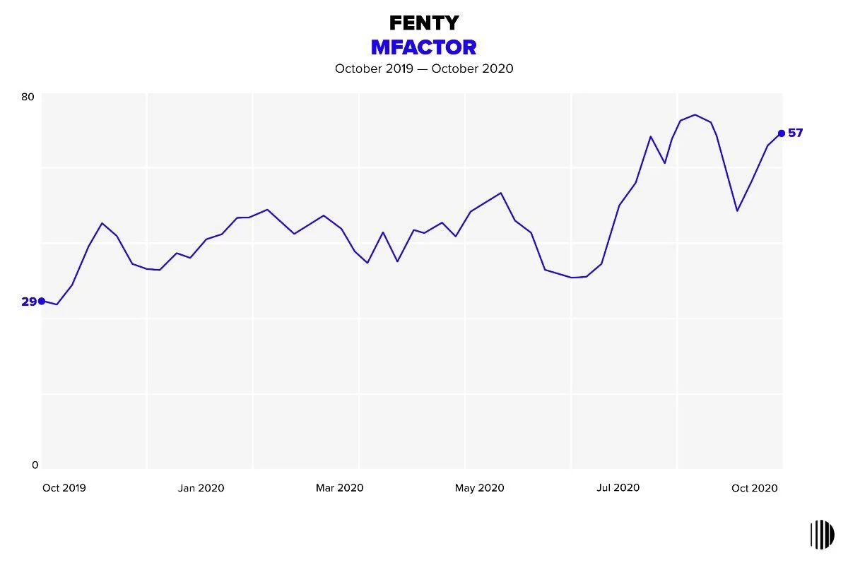 Her MFactor soared from 29 (October 2019) to 57 this month as she evolved her approach by including plus size male models in her Savage x Fenty fashion show. The body positivity movement traditionally focuses on women so her approach to featuring plus size male models for her inaugural mens’ collection breaks down barriers & let plus size males feel heard, represented & celebrated.