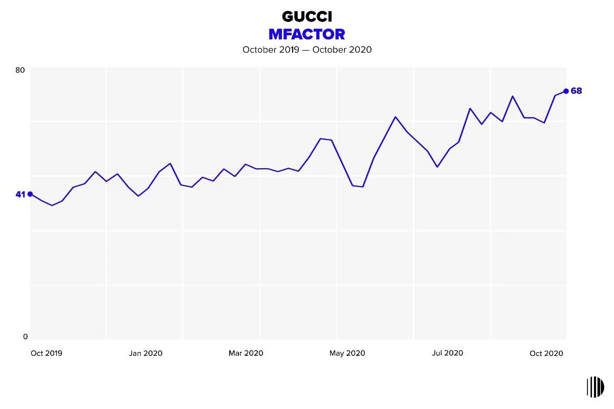 Gucci, with an MFactor that increased from 41 to 66 in just 1 year, is encouraging the “circular economy” approach by partnering with resale platform The Real Real. Together they launched a special Gucci e-shop stocked with a mix of second hand and new Gucci items. For every Gucci item purchased or sold on TRR, the brands will plant a tree through One Tree Planted.