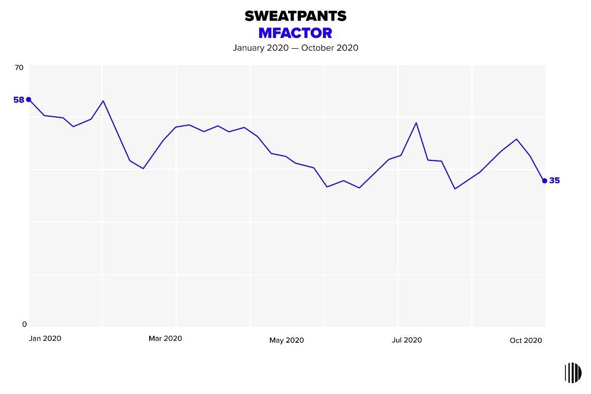 Momentum for sweatpants is on the down from 58 in January to 35 this month because let’s be honest… we can only wear sweatpants and loungewear for so many months in a row.